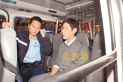 ■IT漢涉嫌擊傷有線電視攝影師,獲准保釋候審。圖為他前日被捕帶署。資料圖片