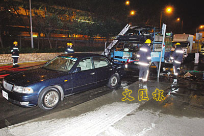 【本報訊】一輛掛有「LC 2」車牌,主要接載立法會秘書長馮載祥的政府房車,昨晨由司機停泊在馬鞍山錦泰苑路邊傷殘人士車位時,卻因停在後面一輛回收廢紙貨車著火焚燒,在火勢猛烈下被輕微波及,消防員到場開喉將火救熄,貨車車頭嚴重被焚毀,事件無人受傷,惟消防員認為火警有可疑,列縱火案交警方跟進調查。就屬下車輛被揭發停泊在傷殘人士專用車位,立法會秘書處對受影響的有關人士致歉,並表示已告誡及再次提醒該車司機需將車停泊在適當車位。