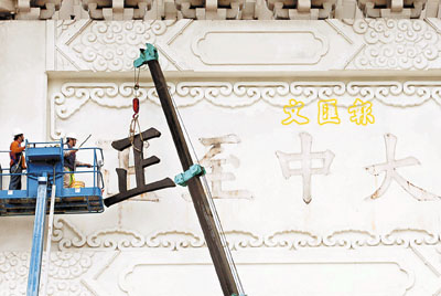 ■「大中至正」牌匾7日下午被台教育部派人完全拆除。圖為最後一個字塊被吊車卸下。中央社