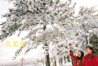12日,受持續大霧天氣和冷空氣的影響,濟南部分地區出現罕見的霧淞美景。遊人在濟南跑馬嶺野生動物世界景區觀賞霧淞美景。新華社