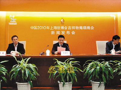 ■上海世博副局長胡勁軍(中)出席世博吉祥物揭曉晚會新聞發佈會。