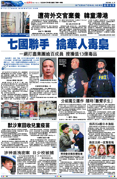 包括加拿大、澳洲、美國、日本和中國等地的警方,經過1年多的追查,終於聯手搗破一個國際販毒集團,在全球拘捕逾100人,包括一名懷疑是集團首腦的40歲華裔男子。行動中警方成功搜獲合共重4,000多公斤的毒品,黑市價估計高達1.68億加元(約12.96億港元)。