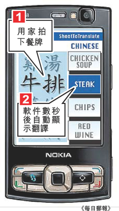 手提電話業龍頭諾基亞(Nokia)前天表示,旗下研發中心花了近5年時間,開發兩個創新手機軟件;首個軟件可翻譯外文餐牌成英文,預計明年年終推出市場,供頂級手機用家應用;另一軟件容許用家「即拍即買」任何心儀物品,但預計最少要3年後才推出。