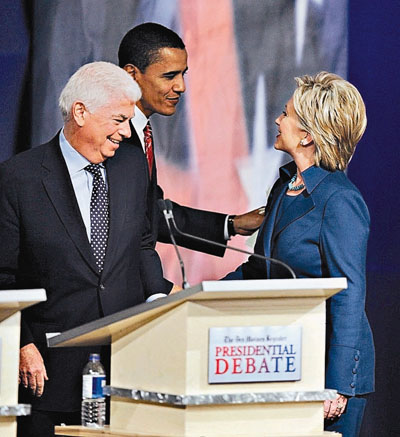 ■提名戰前最後一場辯論,奧巴馬(中)與希拉莉握手。早前希拉莉的競選辦公室主席揭奧巴馬吸毒舊史,希拉莉親自向其道歉。美聯社