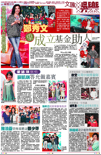 【本報訊】鄭秀文(Sammi)以香港癌症基金會大使身份出席前晚「海洋公園聖誕全城ho ho ho揭幕禮暨香港癌症基金會20周年:同心同fun聖誕夜」,Sammi與一班癌症鬥士欣賞冰上匯演,又細心聆聽由喉癌康復者組成的「新星會」演唱,齊來提早共度一個有意義的聖誕夜。
