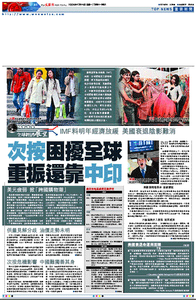 摩根士丹利亞洲區主席羅奇亦認為,「美國經濟正步入衰退」,聯儲局「幾乎肯定」會於短期內再次減息,未來9至12個月調低短期政策利率1到1.5個百分點。羅奇警告,如果其他國家認為這對成長中的亞洲經濟不會造成影響,將會是「嚴重錯誤」。「美國是一個9.5萬億美元(約74萬億港元)的消費社會,中國是1萬億美元(約7.78萬億港元),印度是6,500億美元(約5.06萬億港元),從數字上來看,中國和印度的年輕消費者幾乎不可能填補美國消費需求下跌所留下的空隙。」 ■加拿大通訊社/綜合外電消息