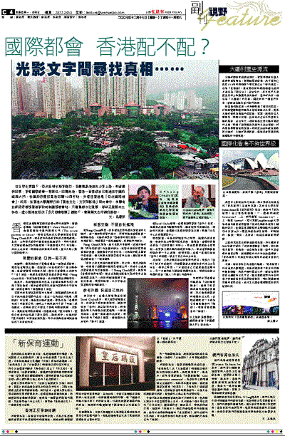 我們很盼望香港真的能成為「亞洲國際都會」,但除了倚靠與內地的經濟合作關係,亦不能忽視保育和發展本土文化,否則香港終有一日成為空有國際都會的「軀殼」,而沒有國際都會的「靈魂」。