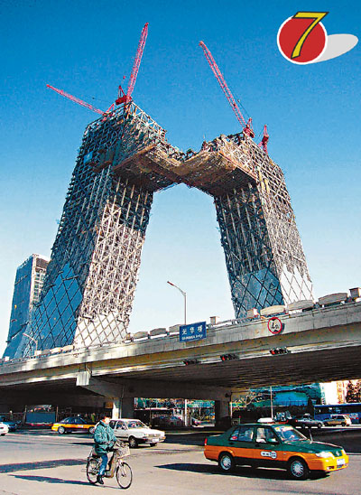 央視主樓的兩座塔樓雙向內傾斜6度,在163米以上由「L」形懸臂結構連為一體,建築外表面的玻璃幕牆由強烈的不規則幾何圖案組成,造型獨特、結構新穎、高新技術含量大,在國內外均屬「高、難、精、尖」的特大型項目。目前該樓的單體建築面積為世界最大。擁有130年發行歷史的著名建築專業雜誌《建築新聞》最新一期的特刊評出「令人驚異的世界十大建築工程」名單上就有央視新址之名。近日,中央電視台新總部大樓兩座斜塔即將合龍,實現空中「握手」。當這座梯形結構完工時,它將成為世界上設計最激進的建築。