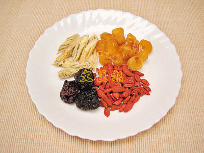 用料:黨參6錢、大棗3粒、圓肉4錢、杞子5錢、薑2片、雞1隻