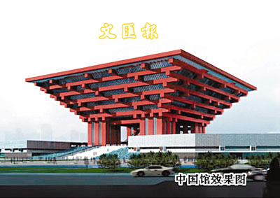 中國館建築外觀以「東方之冠」為構思主題,國家館居中升起、層疊出挑,成為凝聚中國元素、象徵中國精神的雕塑感造型主體;地區館則水平展開,以舒展的平台基座的形態映襯國家館,成為開放、柔性、親民、層次豐富的城市廣場。