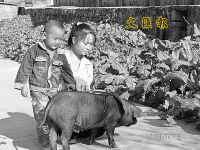 ■大河烏豬養殖戶何韶江的兒媳婦和孫子從烏豬養殖中看到了發家致富的希望。 攝影:本報記者 胡修平