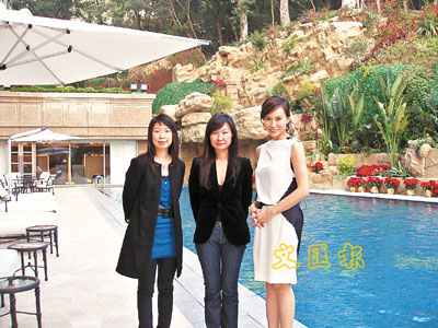 ■顏景鳳(左)及黃瑞華(中)邀請名模楊崢,介紹嘉御山會所的Art Deco建築風格。 本報記者周穎 攝