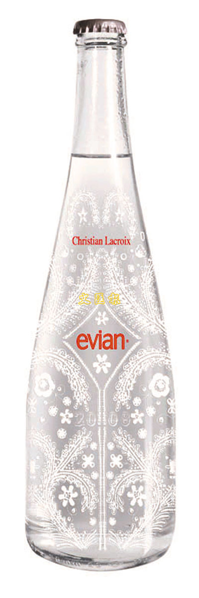 以唯美簡約為基調的Evian Merry Cou Cou雲裳瓶,由頂級法國時裝大師Christian Lacroix操刀設計,透明的瓶身上印滿白色的細小花草圖案,洋溢著白色聖誕的氣氛。中間位置刻上2008的字樣,加上鮮紅色的品牌及設計師名字,白裡透紅,極之搶眼。就正如Lacroix解釋,「這種花草與幾何圖案交織,伴著精巧華麗的圓柱圖飾,富於流線感,猶如60年代新潮而經典的時裝。」