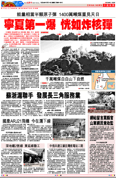 【本報訊】綜合新華社及《新快報》報道:昨天,廣東宏大爆破公司採用硐室爆破的方式,對世界兩大「太西煤」寶礦之一的寧夏大峰煤礦實施爆破。爆破工程共使用炸藥5,400噸,爆破量相當於2006年朝鮮核試驗的6倍,1945年日本廣島原子彈的二分之一,爆破規模世界罕見,被業內稱為「中國煤礦第一爆」。據悉,爆破後,大峰煤礦羊齒採區將改井工開採為露天復採,屆時1,400萬噸「太西煤」便可重見天日。
