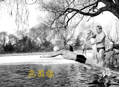 20日,越來越多的瀋陽市民迷上冬泳運動,以強身健體。圖為幾位冬泳愛好者北陵公園游泳。 新華社