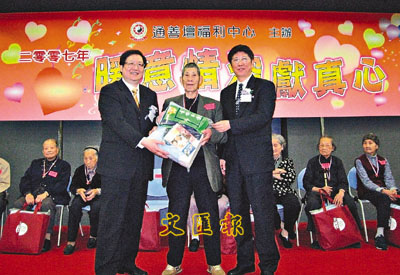 ■王柏濤主席(左)陪同吳仰偉副部長(右)致送禮物包予99歲長者。