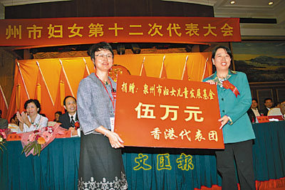 ■黃少玉(左)代表香港代表團捐資五萬元,周真平代接受。