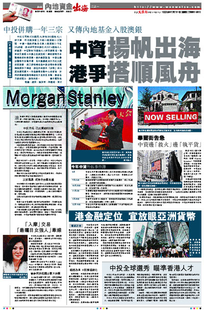 中投公司50億美元入股摩根士丹利,是中投今年繼5月投資30億美元購買美國黑石無投票權的股權單位、11月出資約1億美元參與中鐵H股IPO後的第3宗海外投資,至此中投公司已向海外投資共計81億美元(約632億港元),佔其700億美元海外投資總額的12%。