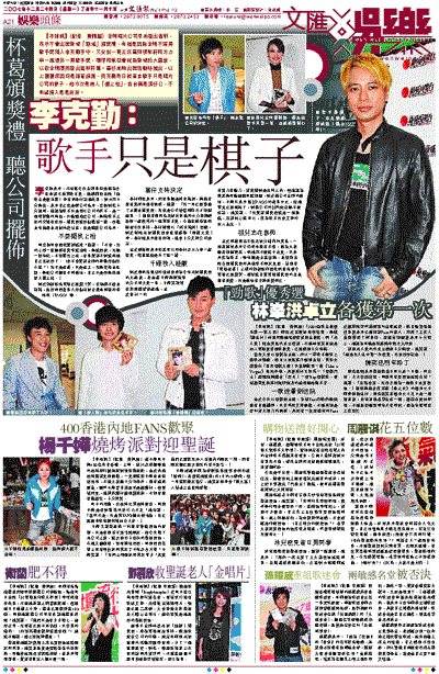 【本報訊】(記者 黃佩麗)金牌唱片公司早前發出聲明,表示不會出席新城「勁爆」頒獎禮,有指是因為金牌不滿男歌手獎落入李克勤手中,又安排一哥古巨基與張敬軒和方力申一起得另一男歌手獎,環球和東亞會成為新城的大贏家,以致金牌憤而發出聲明杯葛。基仔前晚出席活動時指出,以上種種原因均是報章揣測,而克勤昨日就直言歌手只是唱片公司的棋子,他今次是被人「擺上檯」,並自稱是湊仔公,不希望捲入是是非非。