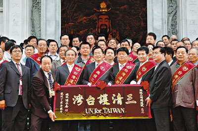 【本報訊】據東森新聞報道:台灣道教總廟23日上午舉行成立大典,藍綠政治人物都沒缺席,馬英九和陳水扁都有參加,只是兩人行程錯開,馬英九前腳剛離開,陳水扁就到。而儘管美國國務卿賴斯才批評入聯公投「挑釁」,陳水扁23日還是送上一塊匾額給廟方,上頭卻註明「UN FOR TAIWAN」格外引人注目。但是來拜拜的信眾卻罵聲連連,他們說政治牽扯宗教實在不適宜!