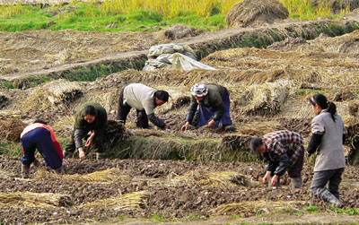 ■此次農村工作會議把「努力保障主要農產品基本供給,積極促進農民增收」確定為農業和農村工作的六項重點工作之一。圖為四川岳池的農民在採摘口蘑。 資料圖片
