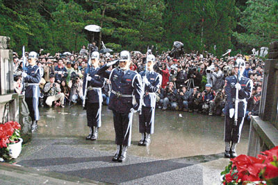■台灣「國防部」慈湖大溪陵寢管理處23日是最後開放日,吸引不少民眾參觀謁靈。圖為下午五時最後一班的儀隊交接向陵寢行舉槍禮的歷史畫面。 中央社