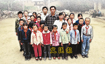 ■民心小學僅有的三位老師:丈夫王進程(中)、妻子汪秀珍(中右)和兒子王曉東(中後)與學生合影。祝莉 攝