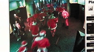 警方相信這班聖誕老人是大學生所扮。戲院經理說,他們把所有東西搞砸,推倒聖誕樹和紙板人,扯下電影海報,還騷擾顧客,大喊色情穢語。他們離開時還觸動火警鐘,顧客被逼離開戲院半小時。雖然閉路電視拍下整個過程(見圖),但滋事者頭戴聖誕帽,面掛白鬍鬚,穿上聖誕老人裝,要認出兇徒的確有困難。 ■綜合外電消息