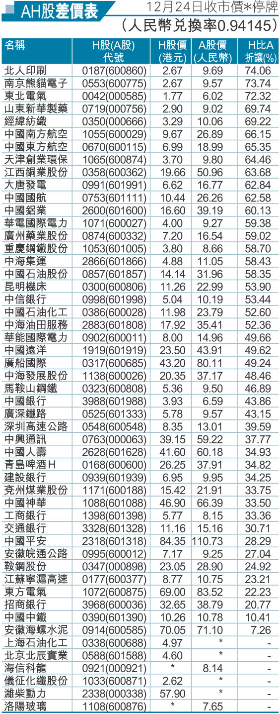 AH股差價表12月24日收市價 (2007-12-25) (圖)