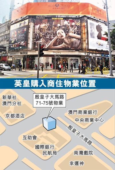 【本報訊】(記者 梁悅琴)英皇國際(0163)昨天宣佈,以4.3億港元收購位於澳門殷皇子大馬路71-75號 / 南灣大馬路526-540號的商住物業,此為該集團在澳門購入的第4個類同物業,顯示該集團進一步擴大在澳門零售收租投資。