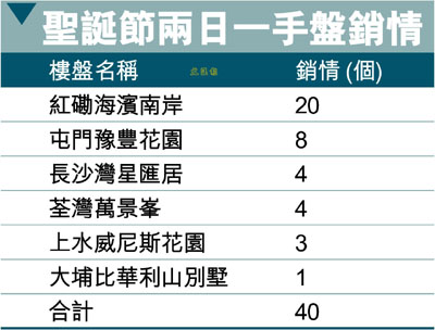 【本報訊】 (記者 蘇曉蕾)今年聖誕,市民較往年有力消費,外遊增多,各區一手盤交投平淡。據市場人士指出,過去兩天,一手市場的睇樓客明顯較上星期少,其中紅磡新盤海濱南岸經上周熱賣後售出約20伙,而各一手盤約售出40個單位。