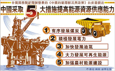 白皮書強調,目前中國能源產量居世界第2位,中國過去不曾、現在沒有、將來也不會對世界能源安全構成威脅。同時,中國能源行業的發展,還將給世界各國帶來更多的發展機遇,也給國際市場帶來廣闊空間。中國將透過發展煤炭產業、電力行業、油氣資源開發、可再生能源等措施,提高能源供應能力。