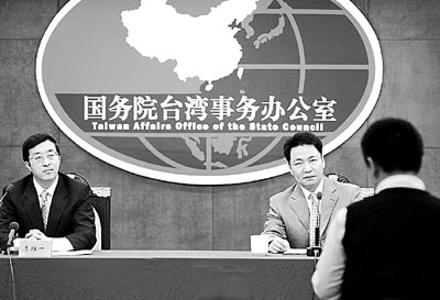 ■26日國務院台灣事務辦公室舉行新聞發佈會。國台辦法規局副局長張萬明(中)出席本次新聞發佈會。新聞發言人李維一(左)答記者問題。中新社