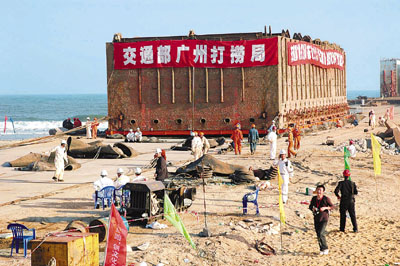 據了解,零時17分時,隨著氣囊的緩緩滾動,沉箱的首部到達碼頭,一台發電機突然跳閘,但沒有影響登陸進程,而此前,連續工作了2小時的一台捲揚機因為發燙,緊急熄火。但上岸過程非常順利。1時13分,整個沉箱全部進入臨時碼頭!「南海一號」成功登陸!當時在現場督陣的廣東省文化廳副廳長景李虎說,終於可以安心睡一覺了。「過了這一關,後面沒有懸念了。」