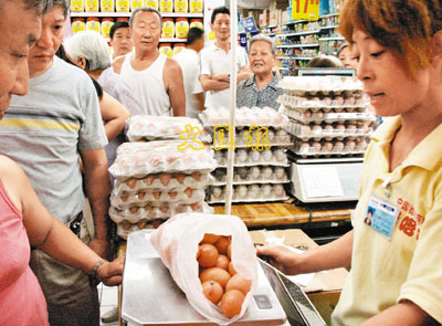 ■中國正面臨食品價格通脹向其他經濟部門蔓延的危險。圖為北京一家大型超市內,眾多家庭主婦和老人耐心地排著長隊,購買3.05元一斤的散裝特價雞蛋。資料圖片