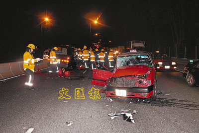 昨凌晨3時30分,黃某駕駛市區的士,載著一名37歲外籍男乘客,沿吐露港公路中線駛出九龍,途至新峰花園對開時,黃某突見一輛7人車疑入錯線,在路中逆線高速飛馳,先撞向前面一輛新界的士左邊車身,導致該的士失控撼向右邊的石壆後,7人車仍繼續向前狂衝。