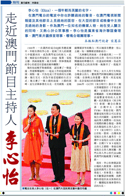 在澳門電台的電波中你也許聽過她的聲音,在澳門電視新聞報道及其他節目上見過她的面容,在大型的節目或晚會中主持見過她的身影。作為澳門一位知名的傳媒人物,她在受人關注的同時,又熱心於公眾事務。李心怡是廣東省海外聯誼會理事、澳門東井圓佛堂理事、嚶鳴合唱團理事。