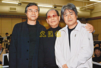 ■顧嘉煇與指揮閻惠昌(左)及藝術統籌梅廣釗(右),昨為音樂會綵排。