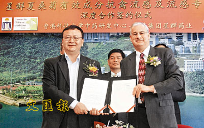 科大早前把這項專科技術,轉讓予內地一間中成藥製造廠星群藥業,由科大負責研究,星群藥業則供應研究原料——夏桑菊及經費,加強粵港兩地以中藥防控禽流感及流感的科研合作,昨天並於科大舉行「抗禽流感及流感專利項目深度合作簽約儀式」。