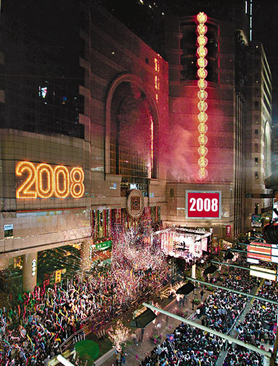 時代廣場的「蘋果倒數」則踏入第14年,今年更大玩奧運概念,以「全港倒數2008迎奧運」為倒數主題,當晚9時會先舉行「萬人同迎奧運年」倒數開幕禮,率先發放約15秒煙火,零時倒數開始時,則會綻放合共40秒的大型煙火,奧運吉祥物福娃及一眾奧運金牌選手,更整晚陪著市民倒數迎接新年。