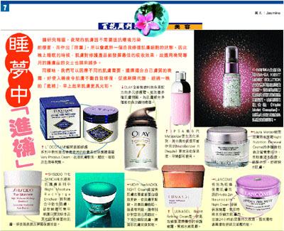 同樣地,我們可以因應不同的肌膚需要,選擇適合自己膚質的晚霜,好使入睡後令肌膚不斷自我修復,促進新陳代謝,經過一晚的「進補」,早上起來肌膚更具光彩。