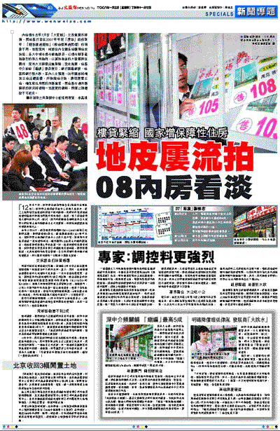 內地樓市去年7月份「大變臉」,交投量驟然降溫,房地產行業在2007年年底「淒涼」迎接新年:「麵粉貴過麵包」(即地價高過房價)的現象不再,包括深圳、成都在內全國各地屢現地皮流拍;各大中城市樓市銷售慘淡,以樓市競爭最為激烈的珠三角為例,以萬科為首的大發展商在廣州、深圳大方降價出售新盤;受此拖累,地產中介紛紛「縮編」慘淡度日;銀行緊縮銀根,地產和銀行股大跌。業內人士預測,08年國家將增加土地出讓面積,抑制囤地行為,清理閒置土地,增保障性用房的供應量等,房地產市場供應緊張的狀況將得到一定程度的緩解,房價上漲趨勢不可避免。