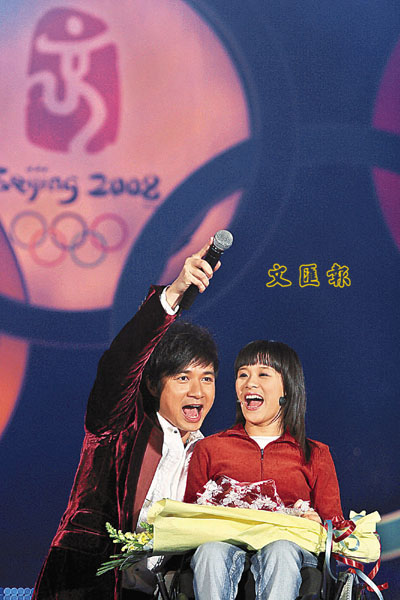 【本報訊】古巨基獲中央電視台與奧委會的邀請,除夕夜在北京參加迎接2008的倒數晚會,同時慶祝中央電視台第五台會由1月1日開始更名為「奧運台」,演出場地更是2008年奧運的摔跤項目的比賽場地,十分有氣氛。基仔與前運動員桑蘭合唱《好想好想》,由於桑蘭坐輪椅的關係,基仔為了拉近距離,所以整首歌都跪在她身旁合唱,並掀起全場大合唱,將現場氣氛推至高潮。