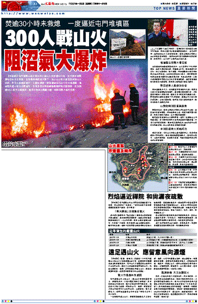 【本報訊】屯門菠蘿山前日發生的三級山火焚燒逾30小時,至今晨本報截稿時仍未完全救熄。在強風和極乾燥天氣下,加上山上有大量枯枝成為山火燃料,昨日火勢越燒越烈,火龍在清晨一度直逼望后石谷小冷水堆填區,當地居民擔心發生沼氣爆炸,幸新界西北消防總動員聯同飛行服務隊、民安隊逾300人集中力量撲救,動用水炮成功截斷火龍,解除沼氣大爆炸危機。