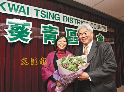 ■鄧國綱(右)、麥美娟(左)分別當選新一屆的葵青區議會正、副主席。本報記者劉國權 攝