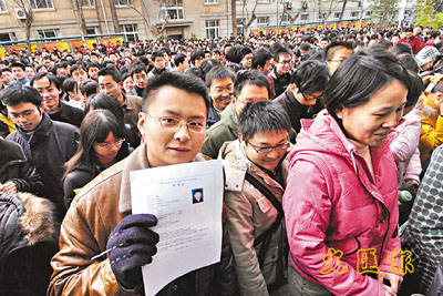 【本報訊】08年國家公務員考試,有64萬考生競爭1.4萬個職位;同時,今年北京市公務員考試,也有3.8萬北京籍應屆畢業生和在京就讀的大學畢業生參加。據調查顯示,62%的人將公務員列為找工作的首選對象,認為工作穩定、福利待遇好、無失業壓力一一考上公務員相當於捧上一隻「金飯碗」,考公務員的大學生更自封為「考碗一族」。