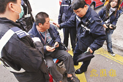 【本報訊】一名因傷殘提早退休警員,疑因綜援金不足應付生活開支,昨晨在葵涌一大廈走廊,報案聲稱要跳樓自殺,警員到場發覺事主坐在輪椅上,並無危險舉動,但情緒激動不停哭泣,痛罵在場拍攝的記者,需警員規勸一番後始肯送院檢驗,並交由駐院社工跟進。