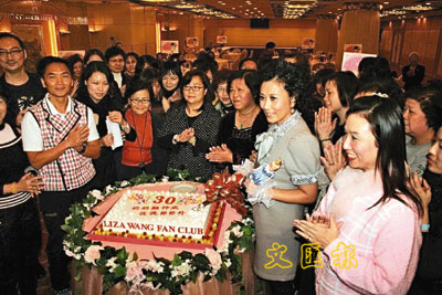 【本報訊】為慶祝「明荃之友會」成立30周年,汪明荃(阿姐)昨日與一百位影迷在尖沙咀一酒店舉行「珍荃友愛三十載」聯歡活動,共筵開8席。阿姐更悉心打扮,以青春造型亮相,左手拿著卡通氣球、右手抱著洋娃娃。當她進場時,眾影迷即大叫她在《野蠻奶奶大戰戈師奶》中的角色名字「O姐」,有影迷更高呼「青春到無得頂啊!」,逗得阿姐開心不已。對於今次與影迷聯歡,阿姐坦言好開心,而影迷們亦十分有心思,特別預備一個寫著「奶奶顯神威 收視節節升」的蛋糕送給阿姐,更有影迷向阿姐送鮮花,之後阿姐就與影迷一起欣賞以前的影迷會照片。