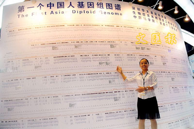 ■2007年10月11日,中國科學家繪製完成第一個完整中國人基因組圖譜。圖為深圳華大基因研究院的講解員在中國人基因組圖譜前向觀眾介紹。 資料圖片