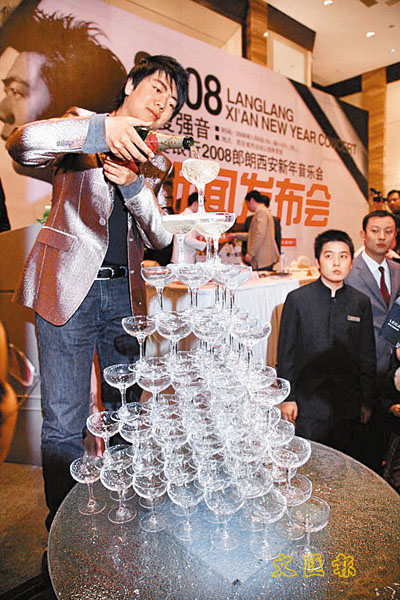 ■郎朗親自為到場嘉賓斟滿香檳,祈求2008年工作順利。本報記者段維 攝